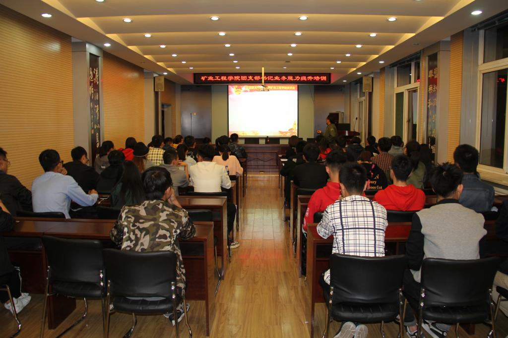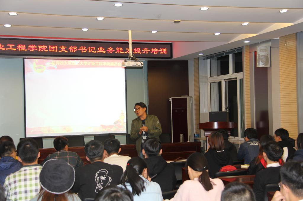 2018年9月29日晚,太阳成集团tyc122ccvip团委在采矿楼二楼学术报告厅召开了团支部书记业务能力提升培训,院团委书记田韶华老师主讲,2016级、2017级58名团支部书记参与了培训。