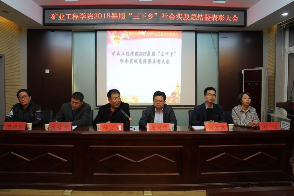 2018年10月19日晚,太阳成集团tyc122ccvip暑期“三下乡”社会实践总结暨表彰大会在虎峪校区采矿楼学术厅顺利举行。公司党政领导薛武杰、冯国瑞、武佐君出席;院团学工作负责人刘宏伟、田韶华、刘安、陈保宇以及65名实践队员代表参加了此次会议。武佐君副书记主持会议。