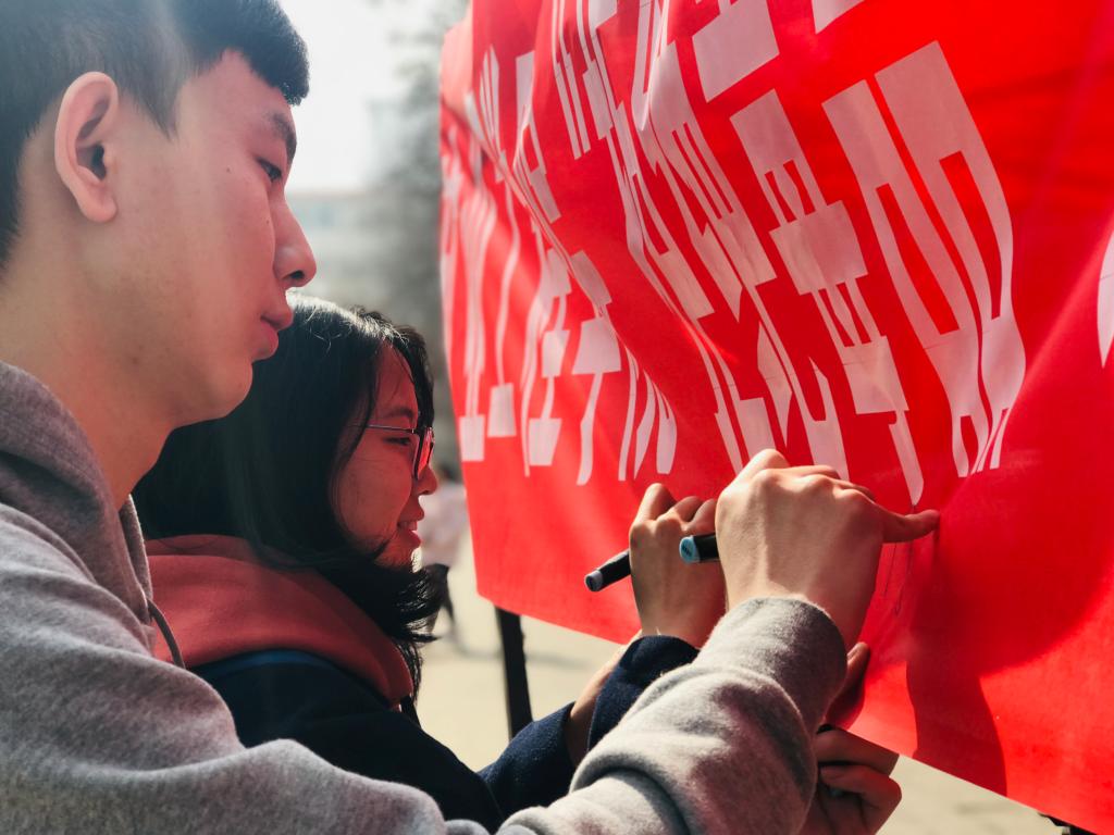 3月4日中午,由矿业公司员工会面向全校员工组织的禁毒宣传活动在虎峪校区碧园餐厅小广场火热进行。精心印制的宣传单很快被同学们领取,往来同学纷纷在宣传条幅上签名言志,公司老师的参与将活动引向了高潮。