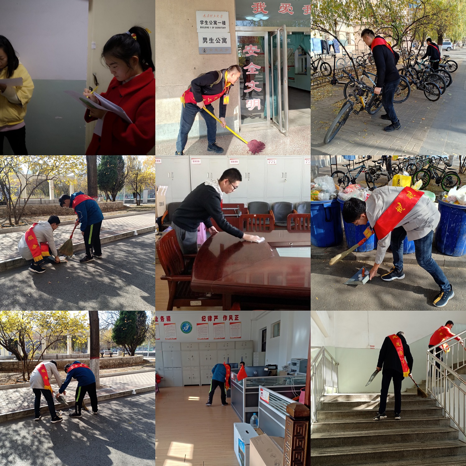公司团学教师、预备党员与志愿者组成了宿舍评比小组根据宿舍卫生检查标准对矿院员工宿舍进行检查评分。志愿者们在虎峪校区带着清扫工具打扫校园,并对致明楼大厅及、楼道、办公室及会议室进行了整理清洁。