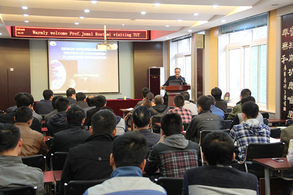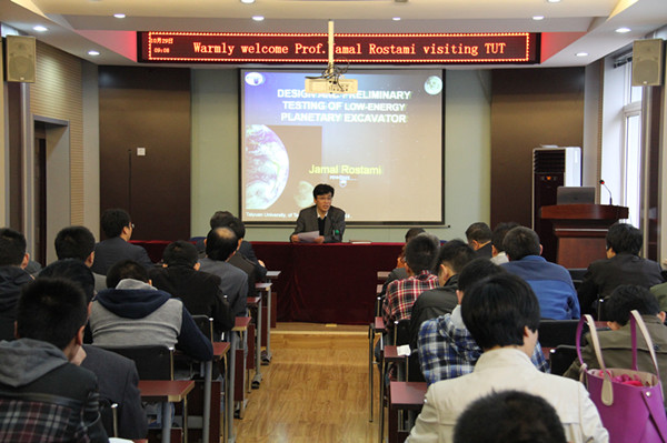 2014年10月29号上午9点,美国宾夕法尼亚州立大学(The Pennsylvania State University)地球与矿业科学公司能源与采矿工程系Jamal Rostami教授应邀在太阳成集团tyc122ccvip学术报告厅做了题为《月球采矿,低耗能挖掘机的设计和初步测试》的专题报告,报告会由经理梁卫国教授主持。