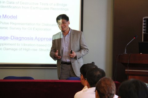 本次学术报告会主要围绕当前国际研究的热点问题结构健康检测中的损伤诊断算法进行展开。通常被大家广泛应用的损伤诊断算法,大多是基于振动原理和数据分析从感官系统中收集信号数据进行分析;也就是可以利用傅里叶谱分析信号数据中基于振动的损伤指数的变化(例如:模态频率,模态曲率),来推断由于结构的力学性能的改变(例如,由于减少刚度而导致的结构或材料的非线性)而对结构造成损害。尽管基于振动的分析方法应经有了很大的进步,但在损伤的定性和定量研究上仍存在一些关键问题有待解决,如果这些问题被解决,将使诊断更加高效和有意义。张教授报告的第一部分主要介绍了时频数据分析方法,它主要用于基于有限数据的局部损伤和全局损伤的检测和量化,可以用两个现实情况来验证上述方法,其一是通过从桥上收集破坏性试验的信号数据来分析损伤,而另一种是通过分析地震过程中地面运动的数据来揭示岩土工程系统中土壤的非线性。报告的第二部分主要介绍了针对大尺度结构破坏情况下的定性和定量分析,提出的基于波的HHT分析方法,旨在探索一套波为基础的损伤指数,来替代和补充基于振动为基础的研究。报告后,参会者就波的传播、损伤监测等方面的问题与张教授进行了充分交流和探讨。