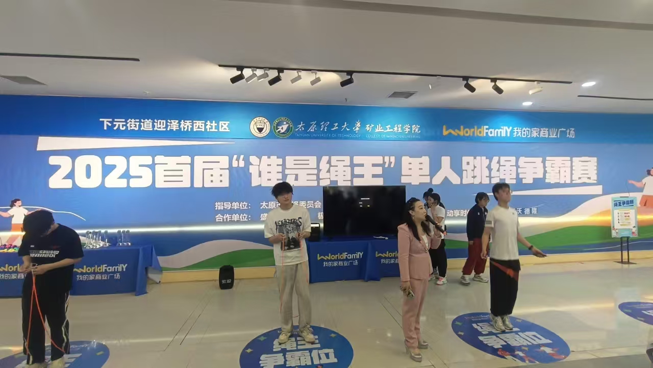 为深化思政育人、实践育人实效,推动校园文化与社区文明共融共建,4月20日,公司联合下元街道迎泽桥西社区、我的家商业广场成功举办“绳王争霸赛”活动。本次活动由太原市跳绳委员会亲自指导,以“跃动太原·健康启航”为主题,共吸引了300余名师生参与。在本次活动中公司共有三名学子获得奖项,其中2024级王熙宏同学以1分钟单摇跳248次的成绩,获得成人组冠军,刷新了本次跳绳比赛成人组记录,获得了全自动洗衣机一台和500元消费卡。