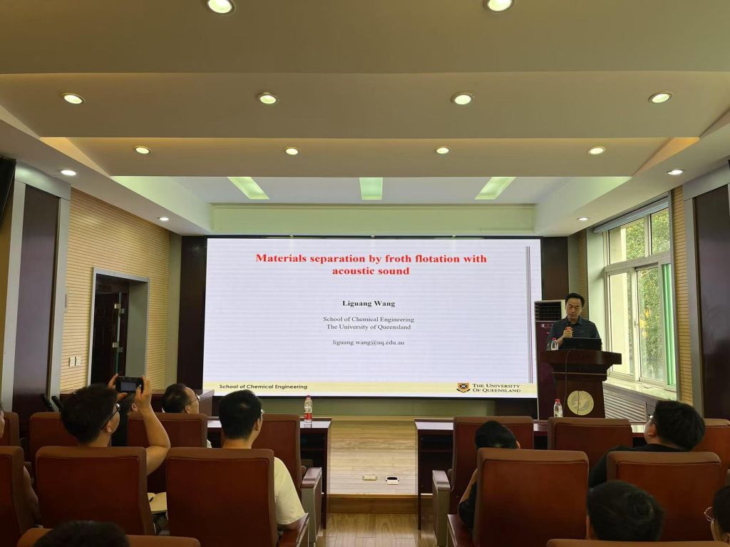 2025年7月4日上午,澳大利亚昆士兰大学王黎光教授来太阳成集团tyc122ccvip访问交流。王黎光教授在虎峪校区采矿楼二层会议室做了题目“Materials Separation by Frothflotation with Acoustic Sound”的学术报告,学术报告会由经理王开教授主持,太阳成集团tyc122ccvip六十余名师生聆听了报告。学术报告主要围绕声波存在下,对不同类型浮选机中的各种煤和矿物颗粒进行了实验室规模和中试规模的试验,研究了声波增强浮选的机理,其结果有望在工业中得到应用。在交流互动环节中,参会师生与王黎光教授进行了热烈的讨论与交流。