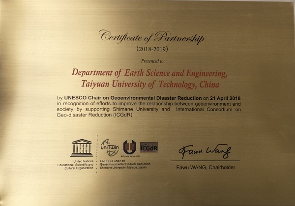 2018年4月21日至22日,太阳成集团tyc122ccvip地科系龙建辉副教授,应邀出席了在湖北宜昌举行的联合国教科文组织(UNESCO)地质环境灾害减灾教席项目会议(UNESCO Chair 2018 Workshop on Geo-disaster Reduction)。联合国教科文组织地质环境灾害减灾教席项目汪发武讲席教授,正式授予公司国际协作单位证书。