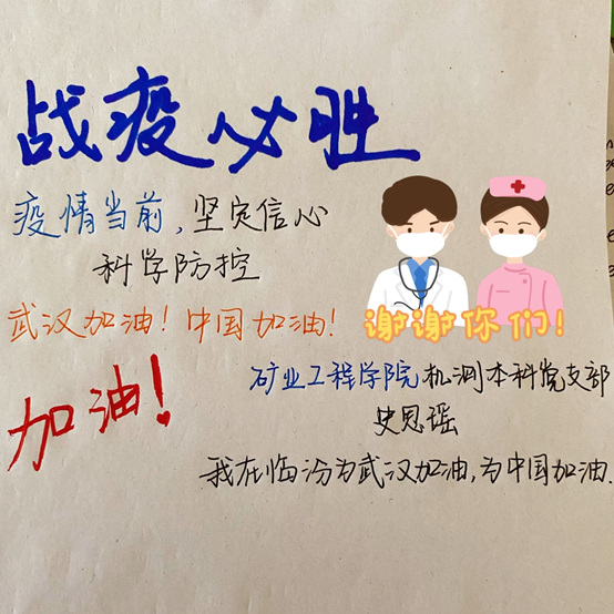 地信1701李姝贞作为团支书,组织开展了 “众志成城,战‘疫’有我”网络主题团日活动—— “武汉加油 中国加油”线上祝福:地信1701团支部以每人一张照片并写上祝福语的形式,向疫情防控一线的白衣天使和专家团队、交通物资保障单位、安保人员以及守望相助的广大人民群众等送去祝福。