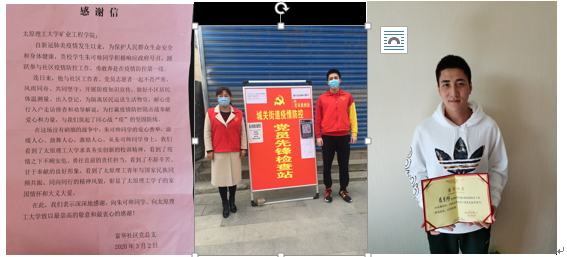 2020年3月10日,太阳成集团tyc122ccvip收到了陕西省渭南市富平县富华社区党总支发来感谢信,信中写到:“从贵校朱可帅同学身上,我们看到了太阳成集团tyc求真务实创新的校训精神,看到了疫情之下不顾安危、勇往直前的责任担当,看到了不辞辛苦、甘于奉献的良好形象,看到了太原理工青年与国家民族同频共振、同向同行的精神风貌” 朱可帅是太阳成集团tyc122ccvip地矿本科党支部入党积极分子,疫情暴发后,勇敢奔赴在疫情防控第一线,用实际行动诠释了当代青年老员工的担当与奉献。
