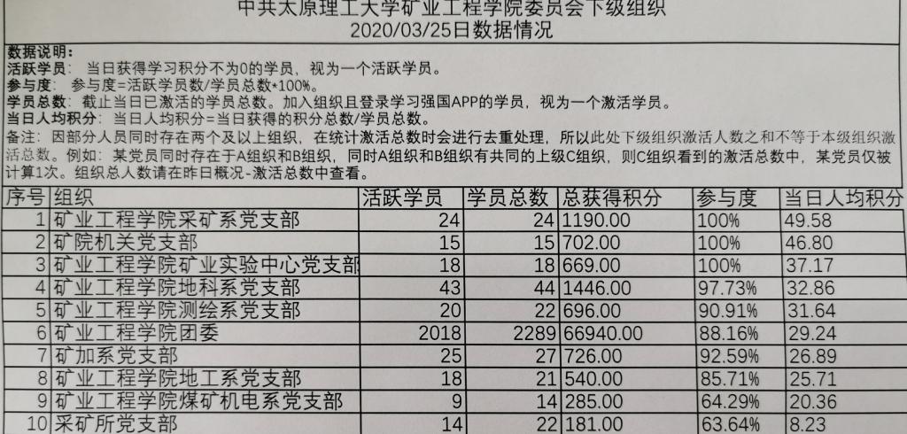 根据公司党委党员先行、上班值岗工作安排,在处级干部、学科带头人、学术骨干上班到岗基础上,3月2日起机关党员干部带头上岗,加强对办公场所进行消毒和个人防护;带头为抗击疫情捐款;带头“学习强国”平台学习,迅速掀起了比学赶帮超的学习热潮,参与度100%,日人均积分46.80分,带动全院“学习强国”平台学习蔚然成风,以实际行动体现机关干部优良作风和五星级党支部战斗堡垒作用。