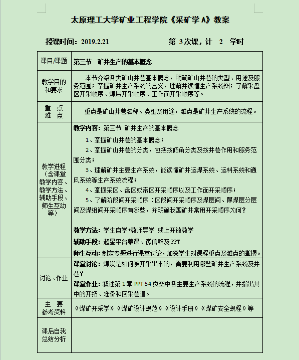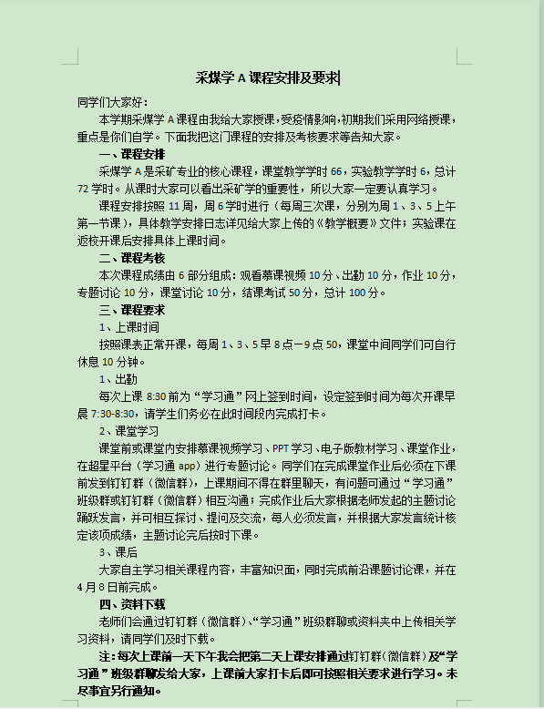 课程组教师在开学前精心准备,积极寻找可利用的网络教学资源,分析网络资源与本课程的配套关系,共同商讨疫情期间特殊的教学计划、授课方式、课程安排、考核方式等事项,制定统一的授课标准和考核标准,根据各自特点开展灵活的授课方式,保证7个班的教学内容、授课进度保持一致,并提前在学习通、微信群、钉钉群向员工发布教学安排,让员工明确新学期《采矿学A》课程的整体教学计划,方便员工制定相应的学习计划。