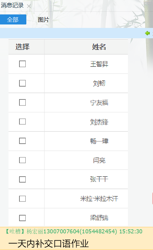 2、口语训练常态化。本课程设置日常口语练习作业,每节课结束基本都需要口头总结本节内容,不允许念,可以列提纲,以训练员工的口头表达能力,以及临场发挥能力。图10和图11分别是某同学上交的口语作业及历次布置过的作业截图,每次除个别同学未按时上交,绝大多数同学都认真完成了。
