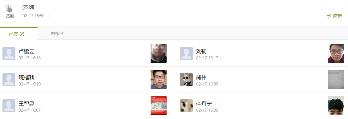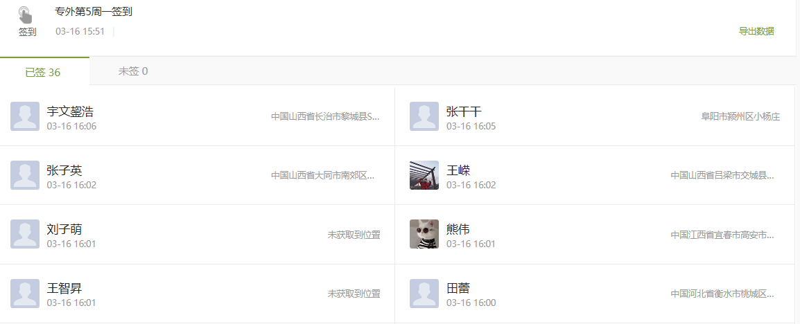 (1)签到是督促员工按时进入课堂的有效方法。固定上课前20分钟开启签到,持续半小时。为了增加员工兴趣,采用了三种签到方式:拍照签到(图1)、位置签到(图2)、以上课节次为手势的签到(图3,最主要的签到方式)、方便老师了解员工,也逐渐让员工形成对本课程的某种学习习惯,增加对老师的了解,同时为开学的疫情防控做准备。两个班共36人,每次签到最多1人不到(注:有个别同学忘记签到,经核实其任务点在课上期间完成则由教师代签)。