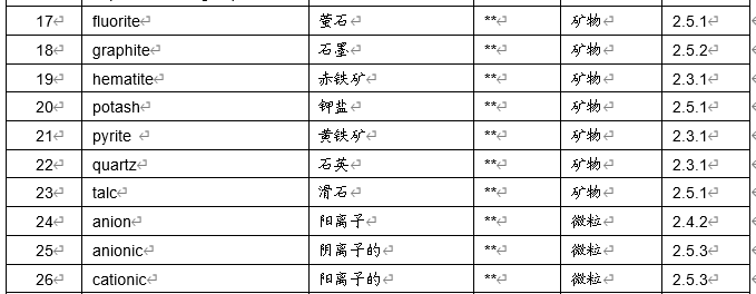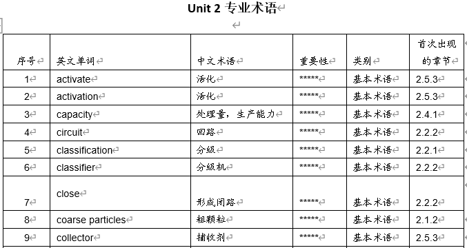 1、专业词汇分类强化。作为专业英语,专业词汇的记忆是首要的,但专业词汇过多,容易让员工畏难,故将生词做分类处理,根据大纲选取一部分作为专业基本术语,是必须熟练掌握的;其它根据类别如矿物名称、药剂、元素、工艺、设备等,做出不同级别的要求。与之呼应,讲义的编写原则也是尽量全面地包括专业核心词汇。图9是为员工归纳的第2单元词汇表,其中标注了重要性和类型,以及首次出现的章节,方便员工有重点地学习、查找。