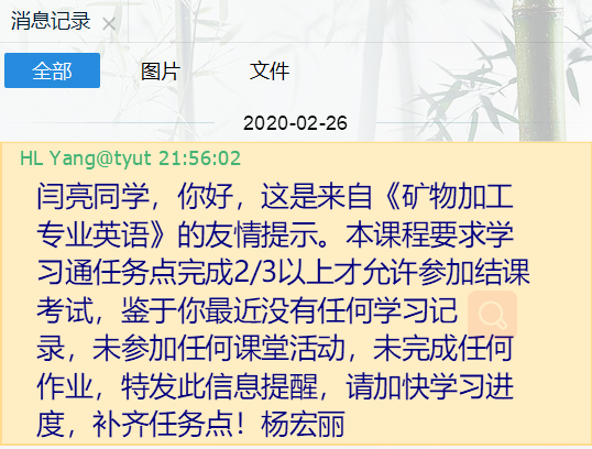 (3)多次旷课的单独提醒,特别提醒旷课超过1/3则不允许考试。效果比较明显,长期很少参加教学活动的一名同学开始来听课,并能完成作业了。图5是通过QQ发送的上课提醒。