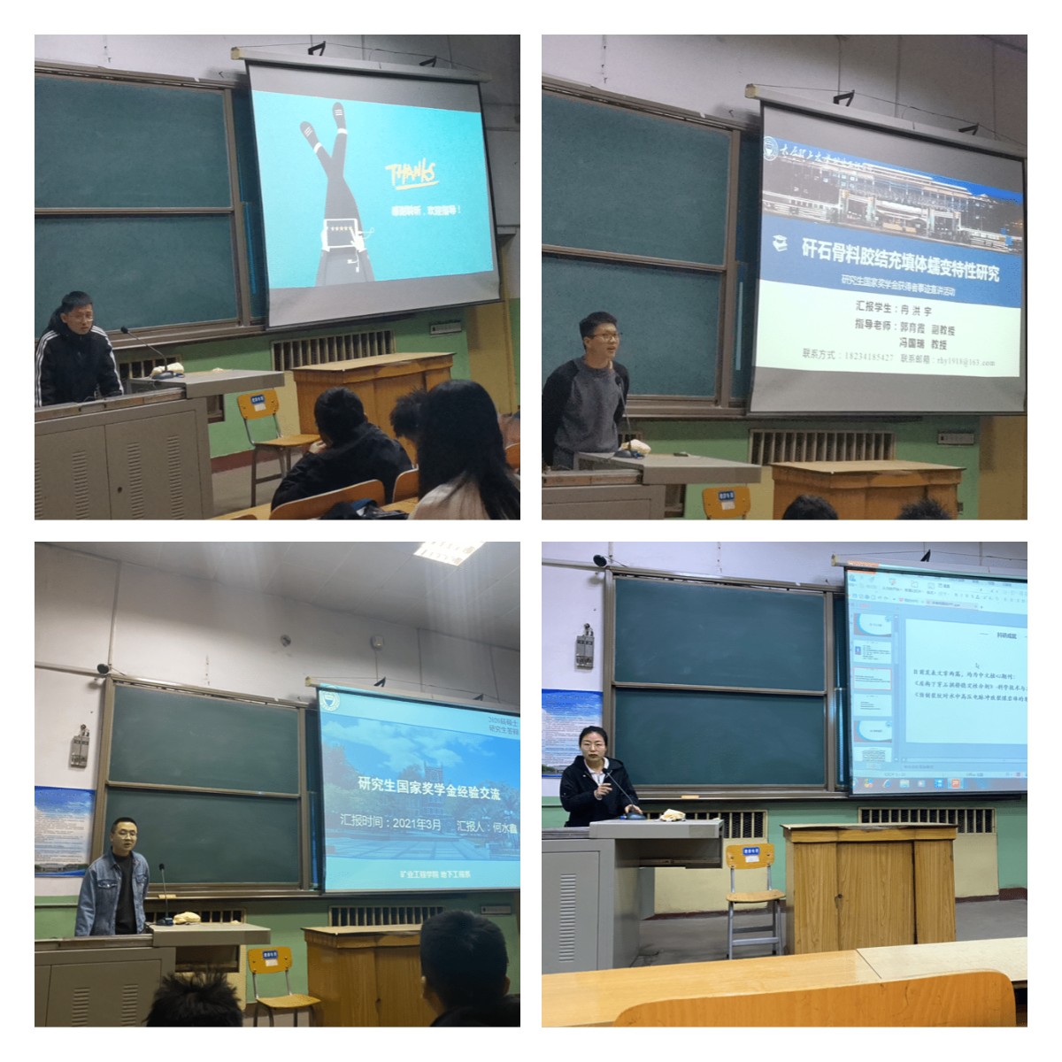 2021年3月24日至26日,2020年研究生国家奖学金获得者事迹宣讲会在梅花教室M1举行。国家奖学金获得者研究生何永鑫、李海琪、冉洪宇、刘一扬、马新世、刘国方、李春明、张纯旺、李晓雪向全院师生依次进行了三场宣讲,五百余名相关学科员工参加了报告会。