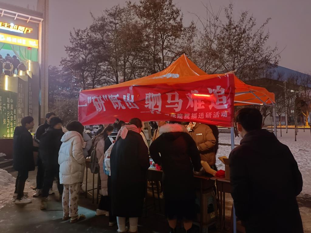 12月13日,虎峪校区碧园餐厅门前,凛冽的寒风,吹不散的是学弟学妹们对考研学子的殷切关怀,飘零的雪花,挡不住青年学子们前进的脚步!一把糖,一张寄语,一个福袋,凝练的是每一个矿院学子对考研员工的浓浓祝福,包裹着的是每一位学子炽热的爱心。