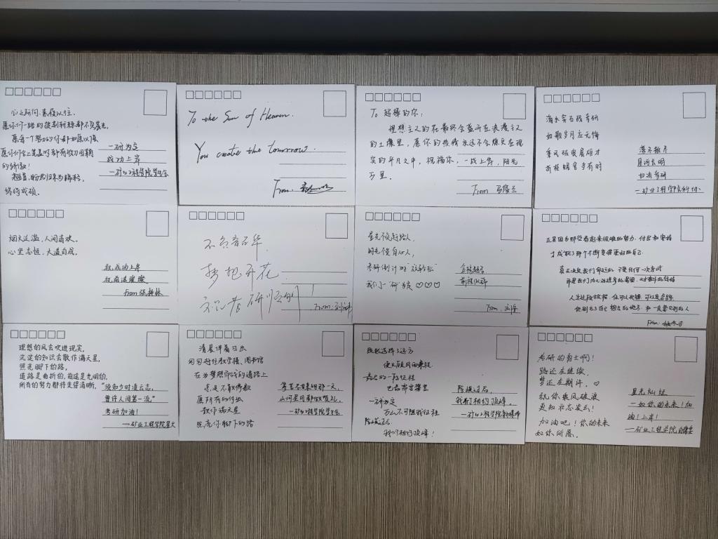 一笔一划,慢慢写,细细品。一张张明信片,将公司每位老师和各员工组织代表以及学弟学妹们对考研学子的祝福承托,薄薄的,又厚厚的,那么轻,却又那么沉重。