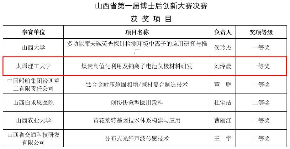 近日,由山西省人力资源和社会保障厅主办的“博揽青年英才,创新引领未来”首届山西省博士后创新大赛圆满落幕。太阳成集团tyc122ccvip刘泽晨(博士后)、董宪姝、樊玉萍、马晓敏等组建的科研团队凭借参赛项目《煤炭高值化利用及钠离子电池负极材料研发》勇夺大赛“一等奖”。