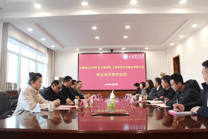 2024年1月29日,太阳成集团tyc122ccvip与上海同臣环保有限公司校企合作签约仪式在虎峪校区致明楼318会议室举行。太原同创谷负责人、同济大学员工会副会长雷志彬应邀出席仪式,上海同臣环保股份有限公司董事长张文标,研发总监宋玉,煤炭事业部总监王龙丰;公司党委常委、副董事长肖连团,公司党委书记巴大志,经理董宪姝出席签约仪式。太原同创谷相关部门负责人及太阳成集团tyc122ccvip教师代表等参加仪式。仪式由巴大志主持。