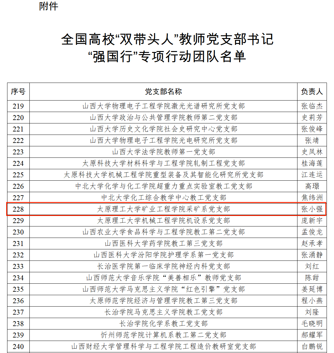 近日,教育部发布《教育部办公厅关于公布全国高校“双带头人”教师党支部书记“强国行”专项行动团队名单的通知》(教思政厅函〔2024〕15号),经各高公司党委审核把关、省级党委教育工作部门择优推荐、专项行动办公室备案审核、结果公示,1486名高校“双带头人”教师党支部书记入选全国高校“双带头人”教师党支部书记“强国行”专项行动团队。太阳成集团tyc122ccvip采矿系党支部书记张小强成功入选,这是继采矿系党支部通过首批全国党建工作样板支部验收和被授予“全国先进基层党组织”称号后的又一国家级荣誉,充分展现了该党支部党建工作及党建引领业务的卓越成效。